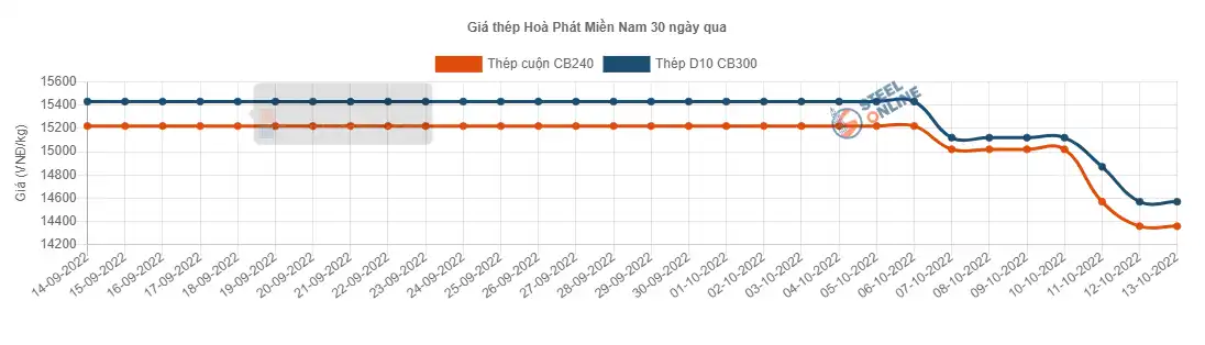 Tại miền Nam thép Hòa Phát điều chỉnh giảm 200 đồng. Hiện dòng thép cuộn CB240 xuống còn 15.280 đồng/kg; thép thanh vằn D10 CB300 có giá 15.940 đồng/kg.